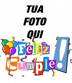 Postal buon compleanno con lettere a colori, stelle filanti e palloncini. Personalizzabile con la tua foto