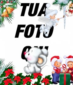 Utilizzare questa cartolina di Natale per aggiungere una foto di un bambino e congratularmi con il Natale con i vostri cari. E decorata con angeli, bambini e un orsacchiotto.
