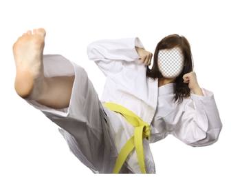 Diventa in un professionista del karate con questo effetto divertente per caricare la tua foto e adatta al vostro volto su questa ragazza con kimono bianco e nastro giallo calci e vedere come divertente vi vedrà in questo effetto di atleta è possibile condividere nei social network e internet .